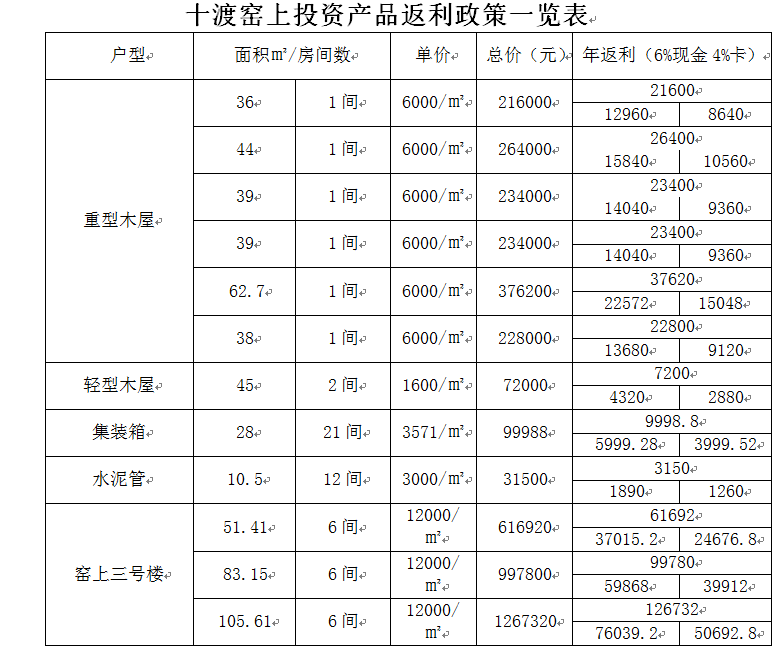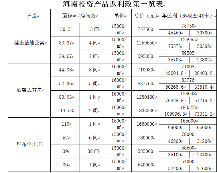 海南三亚健康基地携手保亭雅布田园山庄、北京十渡特色酒店、北京逸轩老年福利中心共同打造房产新理念,例50m²酒店式公寓以15000元/㎡投资,签约后客户可将房产返租给本公司,开发公司以每年总房款10%返还租金,其中6%为现金返还,4%为雅布伦消费卡返还。累计返还10年,10年白赚一套房。10年后如仍交经营公司经营,另行签订《委托经营合同》。