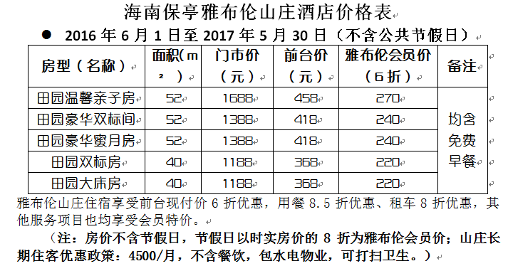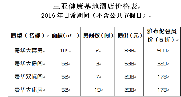 健康基地住宿享受前台现付价6折优惠,租车8折优惠,餐饮8.5折优惠等。(注:房价不含节假日,节假日以时实房价的8折为雅布伦会员价;健康基地客房长期住客优惠政策:4000/月,不含餐饮、不含电费,可打扫卫生。)